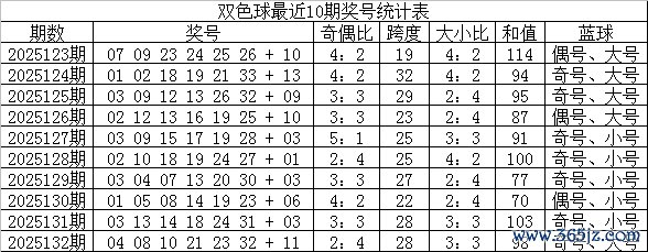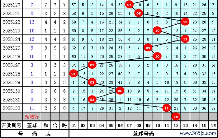 蓝球大小:近50期蓝球大小比为27:23,大号蓝球占优,近10期蓝球大小比为5:5,大小蓝球走势尽头,本期提防大号蓝球11、12。